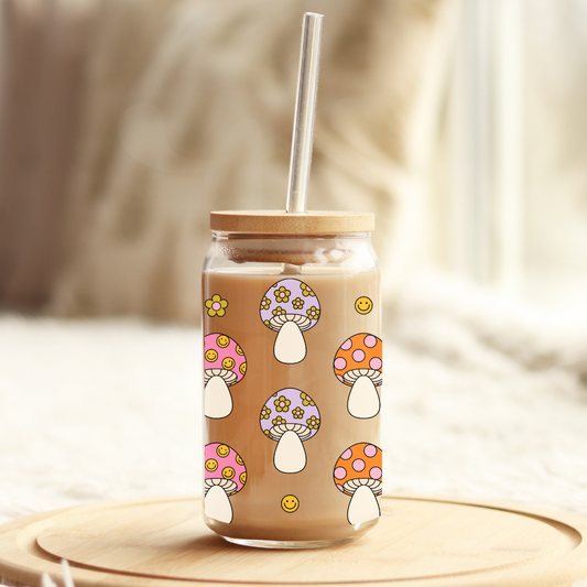 Mushrooms 16oz Glass Can with Bamboo Lid & Glass Straw