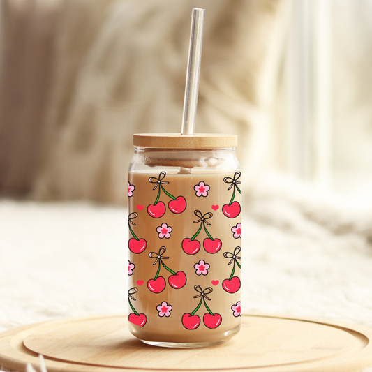 Bow Cherries 16oz Glass Can with Bamboo Lid & Glass Straw