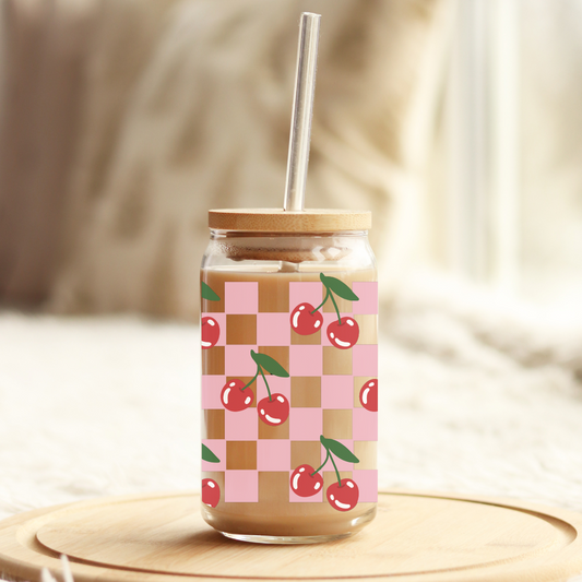 Checkered Cherries 16oz Glass Can with Bamboo Lid & Glass Straw