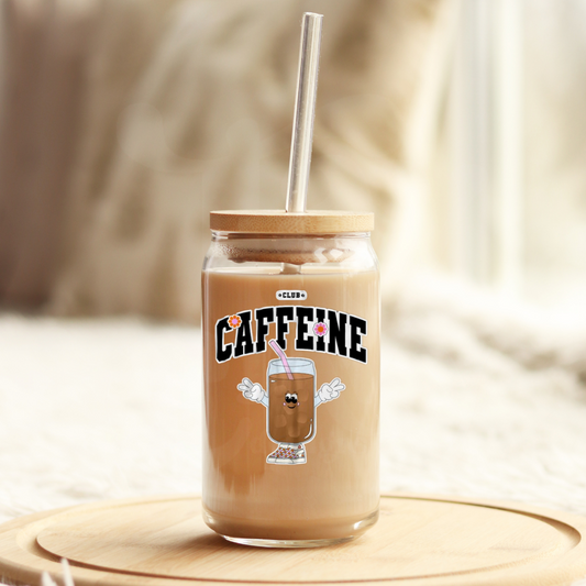 Club Caffeine 16oz Glass Can with Bamboo Lid & Glass Straw