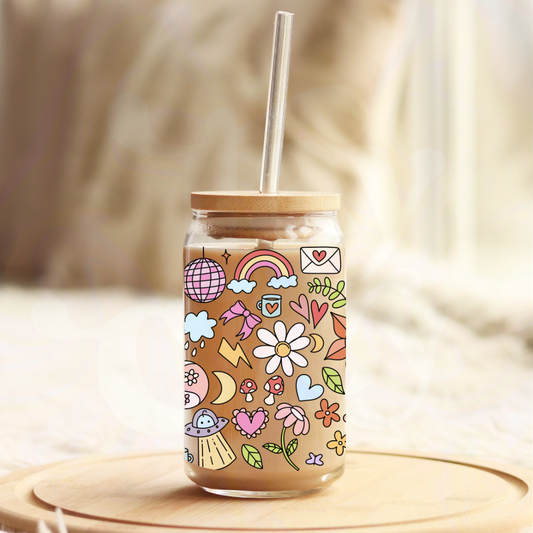 Groovy Doodles 16oz Glass Can with Bamboo Lid & Glass Straw