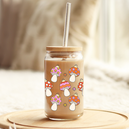 Mushroom Ornaments 16oz Glass Cup with Bamboo Lid & Straw