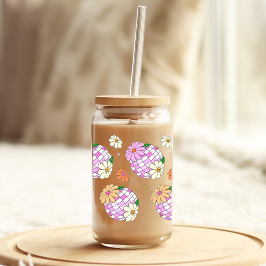 Pink Disco Ball 16oz Glass Can with Bamboo Lid & Glass Straw