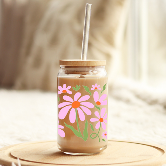Pink Flowers 16oz Glass Can with Bamboo Lid & Glass Straw