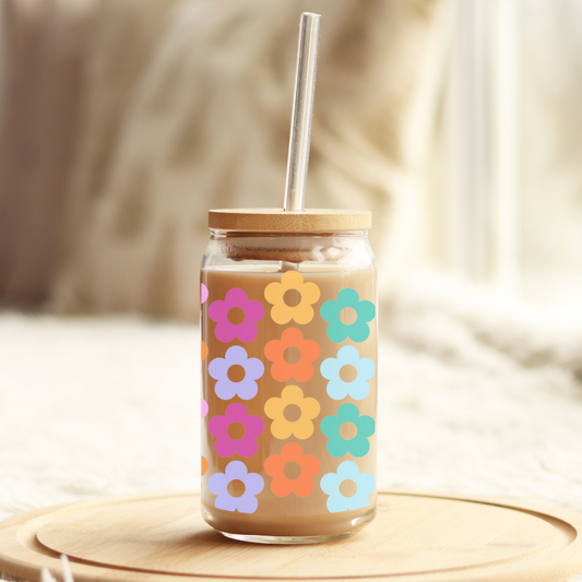Retro Rainbow Flowers 16oz Glass Can with Bamboo Lid & Glass Straw