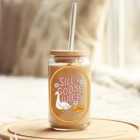 Silly Goose Juice 16oz Glass Can with Bamboo Lid & Glass Straw