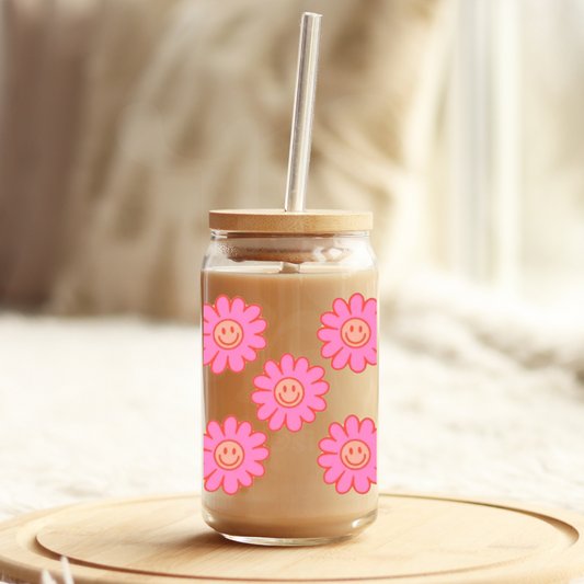 Happy Flower 16 oz Glass Cup with Bamboo Lid & Straw