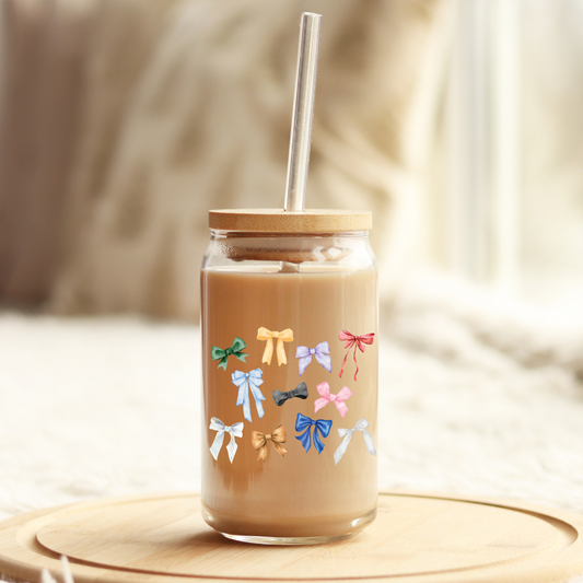 TS Era Bows 16oz Glass Can with Bamboo Lid & Glass Straw- Sold Out