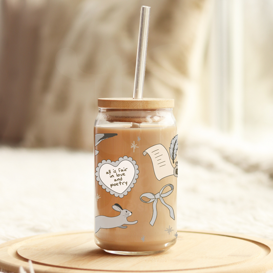 All is Fair in Love and Poerty TTPD 16oz Glass Can with Bamboo Lid & Glass Straw