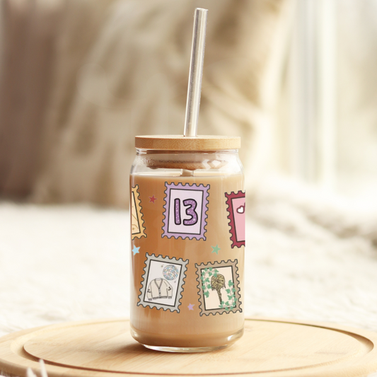 Eras Stamps 16oz Glass Can with Bamboo Lid & Glass Straw